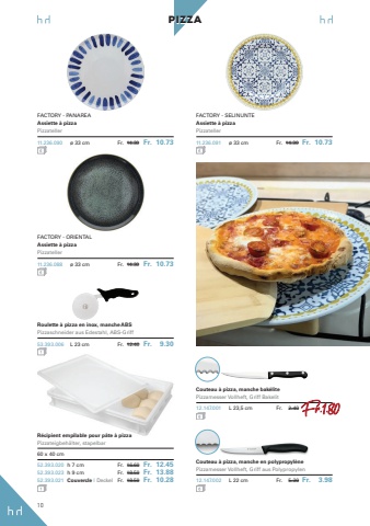 10PIZZARoulette %u00e0 pizza en inox, manche ABSPizzaschneider aus Edestahl, ABS-Griff53.393.006 L 23 cm Fr. 12.40 Fr. 9.30FACTORY - PANAREAAssiette %u00e0 pizzaPizzateller11.236.090 %u00f8 33 cm Fr. 14.30 Fr. 10.73 FACTORY - SELINUNTEAssiette %u00e0 pizzaPizzateller11.236.091 %u00f8 33 cm Fr. 14.30 Fr. 10.73FACTORY - ORIENTALAssiette %u00e0 pizzaPizzateller11.236.088 %u00f8 33 cm Fr. 14.30 Fr. 10.73Couteau %u00e0 pizza, manche bak%u00e9litePizzamesser Vollheft, Griff Bakelit12.147.001 L 23,5 cm Fr. 2.40Couteau %u00e0 pizza, manche en polypropyl%u00e8nePizzamesser Vollheft, Griff aus Polypropylen12.147.002 L 22 cm Fr. 5.30 Fr. 3.98R%u00e9cipient empilable pour p%u00e2te %u00e0 pizzaPizzateigbeh%u00e4lter, stapelbar60 x 40 cm52.393.020 h 7 cm Fr. 16.60 Fr. 12.4552.393.023 h 9 cm Fr. 18.50 Fr. 13.8852.393.021 Couvercle I Deckel Fr. 18.50 Fr. 10.28Fr.1.80