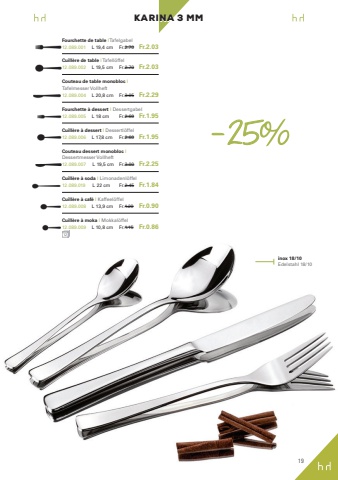 19KARINA 3 MMFourchette de table ITafelgabel12.089.001 L 19,4 cm Fr.2.70 Fr.2.03Cuill%u00e8re de table ITafell%u00f6ffel12.089.002 L 19,5 cm Fr.2.70 Fr.2.03Couteau de table monobloc ITafelmesser Vollheft12.089.004 L 20,8 cm Fr.3.05 Fr.2.29Fourchette %u00e0 dessert I Dessertgabel12.089.005 L 18 cm Fr.2.60 Fr.1.95Cuill%u00e8re %u00e0 dessert I Dessertl%u00f6ffel12.089.006 L 17,8 cm Fr.2.60 Fr.1.95Couteau dessert monobloc IDessertmesser Vollheft12.089.007 L 19,5 cm Fr.3.00 Fr.2.25Cuill%u00e8re %u00e0 soda I Limonadenl%u00f6ffel12.089.019 L 22 cm Fr.2.45 Fr.1.84Cuill%u00e8re %u00e0 caf%u00e9 I Kaffeel%u00f6ffel12.089.008 L 13,9 cm Fr.1.20 Fr.0.90Cuill%u00e8re %u00e0 moka I Mokkal%u00f6ffel12.089.009 L 10,8 cm Fr.1.15 Fr.0.8619inox 18/10Edelstahl 18/10-25