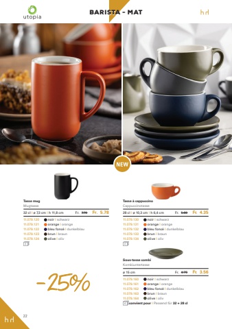 22BARISTA - MATTasse mugMugtasse32 cl I %u00f8 7,3 cm I h 11,8 cm Fr. 7.70 Fr. 5.7811.079.120 noir I schwarz11.079.121 orange I orange11.079.122 bleu fonc%u00e9 I dunkelblau11.079.123 brun I braun11.079.124 olive I olivTasse %u00e0 cappuccinoCappuccinotasse28 cl I %u00f8 10,3 cm I h 6,4 cm Fr. 5.80 Fr. 4.3511.079.130 noir I schwarz11.079.131 orange I orange11.079.132 bleu fonc%u00e9 I dunkelblau11.079.133 brun I braun11.079.134 olive I olivSous-tasse combiKombiuntertasse%u00f8 15 cm Fr. 4.75 Fr. 3.5611.079.160 noir I schwarz11.079.161 orange I orange11.079.162 bleu fonc%u00e9 I dunkelblau11.079.163 brun I braun11.079.164 olive I olivconvient pour I Passend f%u00fcr 32 + 28 cl-25