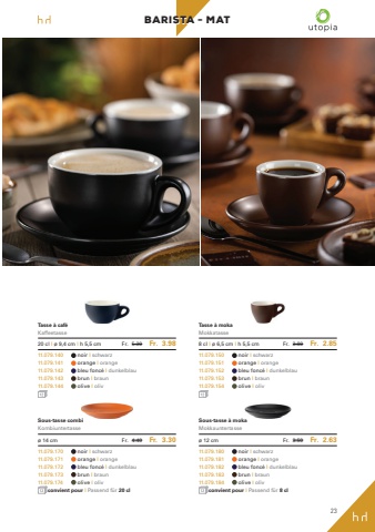 23BARISTA - MATTasse %u00e0 caf%u00e9Kaffeetasse20 cl I %u00f8 9,4 cm I h 5,5 cm Fr. 5.30 Fr. 3.9811.079.140 noir I schwarz11.079.141 orange I orange11.079.142 bleu fonc%u00e9 I dunkelblau11.079.143 brun I braun11.079.144 olive I olivTasse %u00e0 mokaMokkatasse8 cl I %u00f8 6,5 cm I h 5,5 cm Fr. 3.80 Fr. 2.8511.079.150 noir I schwarz11.079.151 orange I orange11.079.152 bleu fonc%u00e9 I dunkelblau11.079.153 brun I braun11.079.154 olive I olivSous-tasse %u00e0 mokaMokkauntertasse%u00f8 12 cm Fr. 3.50 Fr. 2.6311.079.180 noir I schwarz11.079.181 orange I orange11.079.182 bleu fonc%u00e9 I dunkelblau11.079.183 brun I braun11.079.184 olive I olivconvient pour I Passend f%u00fcr 8 clSous-tasse combiKombiuntertasse%u00f8 14 cm Fr. 4.40 Fr. 3.3011.079.170 noir I schwarz11.079.171 orange I orange11.079.172 bleu fonc%u00e9 I dunkelblau11.079.173 brun I braun11.079.174 olive I olivconvient pour I Passend f%u00fcr 20 cl