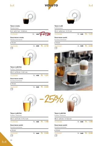 24VOLUTOTasse %u00e0 mokaMokkatasse9 cl I %u00f8 5,7 cm I h 6,8 cm13.274.001 Fr. 1.65Sous-tasse %u00e0 mokaMokkauntertasse%u00f8 12 cm13.274.002 Fr. 2.80 Fr. 2.10Tasse %u00e0 caf%u00e9/th%u00e9Kaffee-/Teetasse25 cl I %u00f8 7,5 cm I h 9,1 cm13.274.003 Fr. 1.75 Fr. 1.31Sous-tasse combiKombiuntertasse%u00f8 14 cm13.274.007 Fr. 3.25 Fr. 2.44Tasse %u00e0 caf%u00e9/th%u00e9Kaffee-/Teetasse32 cl I %u00f8 7,7 cm I h 11,1 cm13.274.004 Fr. 1.95 Fr. 1.46Sous-tasse combiKombiuntertasse%u00f8 14 cm13.274.007 Fr. 3.25 Fr. 2.44Tasse %u00e0 caf%u00e9/th%u00e9Kaffee-/Teetasse40 cl I %u00f8 8 cm I h 12,3 cm13.274.005 Fr. 2.65 Fr. 1.99Sous-tasse combiKombiuntertasse%u00f8 14 cm13.274.007 Fr. 3.25 Fr. 2.44Tasse %u00e0 caf%u00e9Kaffeetasse22 cl I %u00f8 8,2 cm I h 7,1 cm13.274.006 Fr. 1.75 Fr. 1.31Sous-tasse combiKombiuntertasse%u00f8 14 cm13.274.007 Fr. 3.25 Fr. 2.44-25Fr.1.24