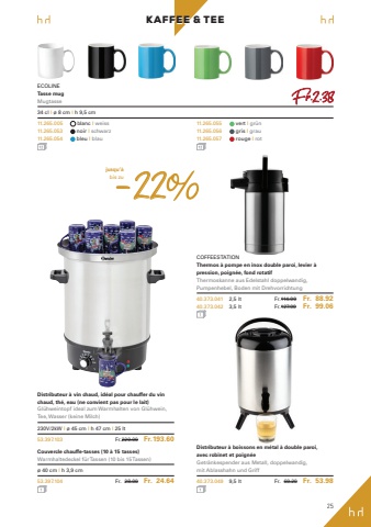 25KAFFEE & TEEECOLINETasse mugMugtasse34 cl I %u00f8 8 cm I h 9,5 cm11.265.005 blanc I weiss11.265.053 noir I schwarz11.265.054 bleu I blau11.265.055 vert I gr%u00fcn11.265.056 gris I grau11.265.057 rouge I rotDistributeur %u00e0 vin chaud, id%u00e9al pour chauffer du vin chaud, th%u00e9, eau (ne convient pas pour le lait)Gl%u00fchweintopf ideal zum Warmhalten von Gl%u00fchwein,Tee, Wasser (keine Milch)230V/2kW I %u00f8 45 cm I h 47 cm I 25 lt53.397.103 Fr.220.00 Fr.193.60Couvercle chauffe-tasses (10 %u00e0 15 tasses)Warmhaltedeckel f%u00fcr Tassen (10 bis 15 Tassen)%u00f8 40 cm I h 3,9 cm53.397.104 Fr. 28.00 Fr. 24.64Distributeur %u00e0 boissons en m%u00e9tal %u00e0 double paroi,avec robinet et poign%u00e9eGetr%u00e4nkespender aus Metall, doppelwandig,mit Ablasshahn und Griff40.373.049 9,5 lt Fr. 69.20 Fr. 53.98COFFEESTATIONThermos %u00e0 pompe en inox double paroi, levier %u00e0 pression, poign%u00e9e, fond rotatifThermoskanne aus Edelstahl doppelwandig, Pumpenhebel, Boden mit Drehvorrichtung40.373.041 2,5 lt Fr.114.00 Fr. 88.9240.373.042 3,5 lt Fr.127.00 Fr. 99.06jusqu%u2019%u00e0bis zu-22Fr.2.38