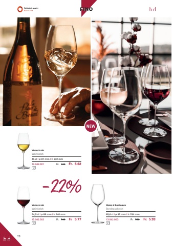 26FINOVerre %u00e0 vinWeinkelch45 cl I %u00f8 81 mm I h 232 mm13.042.001 Fr. 7.20 Fr. 5.62Verre %u00e0 vinWeinkelch54,5 cl I %u00f8 88 mm I h 240 mm13.042.002 Fr. 7.40 Fr. 5.77Verre %u00e0 BordeauxBordeauxkelch65,6 cl I %u00f8 95 mm I h 254 mm13.042.003 Fr. 7.60 Fr. 5.93-22