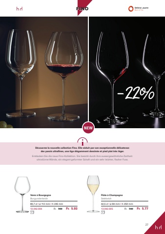27FINOVerre %u00e0 BourgogneBurgunderkelch80,7 cl I %u00f8 112 mm I h 245 mm13.042.004 Fr. 7.60 Fr. 5.93Fl%u00fbte %u00e0 ChampagneSektkelch42,5 cl I %u00f8 84 mm I h 250 mm13.042.005 Fr. 7.40 Fr. 5.77D%u00e9couvrez la nouvelle collection Fino. Elle s%u00e9duit par son exceptionnelle d%u00e9licatesse:des parois ultrafines, une tige %u00e9l%u00e9gamment dessin%u00e9e et pied plat tr%u00e8s l%u00e9ger.Entdecken Sie die neue Fino-Kollektion. Sie besicht durch ihre aussergew%u00f6hnliche Zartheit: ultrad%u00fcnne W%u00e4nde, ein elegant geformter Schaft und ein sehr leichter, flacher Fuss.-22