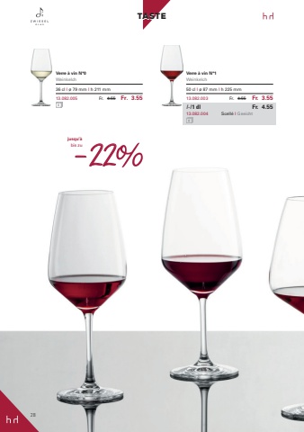 28TASTEVerre %u00e0 vin N%u00b00Weinkelch36 cl I %u00f8 79 mm I h 211 mm13.082.005 Fr. 4.55 Fr. 3.55Verre %u00e0 vin N%u00b01Weinkelch50 cl I %u00f8 87 mm I h 225 mm13.082.003 Fr. 4.55 Fr. 3.55l-l 1 dl Fr. 4.5513.082.004 Scell%u00e9 I Geeicht28-22jusqu%u2019%u00e0bis zu