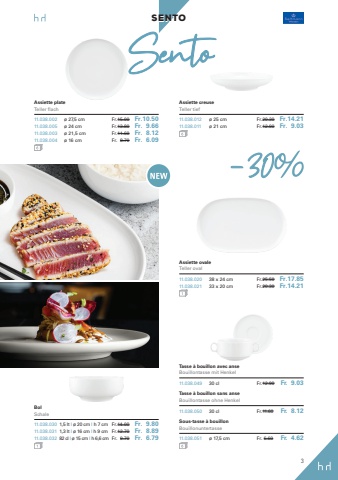 3SENTO-30Assiette plateTeller flach11.038.002 %u00f8 27,5 cm Fr.15.00 Fr.10.5011.038.005 %u00f8 24 cm Fr.13.80 Fr. 9.6611.038.003 %u00f8 21,5 cm Fr.11.60 Fr. 8.1211.038.004 %u00f8 16 cm Fr. 8.70 Fr. 6.09Assiette creuseTeller tief11.038.012 %u00f8 25 cm Fr.20.30 Fr.14.2111.038.011 %u00f8 21 cm Fr.12.90 Fr. 9.03Assiette ovaleTeller oval11.038.020 38 x 24 cm Fr.25.50 Fr.17.8511.038.021 33 x 20 cm Fr.20.30 Fr.14.21BolSchale11.038.030 1,5 lt I %u00f8 20 cm I h 7 cm Fr.14.00 Fr. 9.8011.038.031 1,3 lt I %u00f8 16 cm I h 9 cm Fr.12.70 Fr. 8.8911.038.032 82 cl I %u00f8 15 cm I h 6,6 cm Fr. 9.70 Fr. 6.79SentoTasse %u00e0 bouillon avec anseBouillontasse mit Henkel11.038.049 30 cl Fr.12.90 Fr. 9.03Tasse %u00e0 bouillon sans anseBouillontasse ohne Henkel11.038.050 30 cl Fr.11.60 Fr. 8.12Sous-tasse %u00e0 bouillonBouillonuntertasse11.038.051 %u00f8 17,5 cm Fr. 6.60 Fr. 4.62