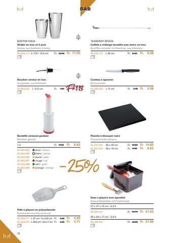 36BARBOSTON YOKAIShaker en inox en 2 pcesShaker aus Edelstahl 2-teilig30.369.212 h 17,5 / 12,5 cm Fr. 23.00 Fr. 17.25Planche %u00e0 d%u00e9couper noireTranchierbrett schwarz52.391.004 30 x 20 cm Fr. 19.80 Fr. 14.8552.391.003 25 x 15 cm Fr. 11.50 Fr. 8.63Seau %u00e0 gla%u00e7ons avec %u00e9gouttoirEisw%u00fcrfelbeh%u00e4lter mit Tropfeinsatz27 x 27 x 15 cm I 5,4 lt30.369.013 Fr. 54.70 Fr. 41.0320 x 20 x 17 cm I 3,4 lt30.369.012 Fr. 36.80 Fr. 27.60Couteau %u00e0 agrumesZitrusmesser52.390.005 L 11 cm Fr. 5.30 Fr. 3.98TEARDROP SPOONCuill%u00e8re %u00e0 m%u00e9lange torsad%u00e9e avec larme, en inoxBarl%u00f6ffel verdreht mit Teardrop, aus Edelstahl30.369.127 L 40 cm Fr. 11.30 Fr. 8.48Pelle %u00e0 gla%u00e7ons en polycarbonateEisschaufel aus Polycarbonat30.369.017 L 27 cm I 4 x 9,5 cm Fr. 6.60 Fr. 4.9530.369.016 L 20,5 cm I 3,5 x 7 cm Fr. 4.95 Fr. 3.71Bouteille verseuse gradu%u00e9eBeh%u00e4lter geeicht1 lt Fr. 11.50 Fr. 8.6330.369.094 brun I braun30.369.095 blanc I weiss30.369.096 jaune I gelb30.369.097 rouge I rot30.369.098 vert I gr%u00fcn30.369.099 orange I orange-25Bouchon verseur en inoxAusgiesser aus Edelstahl30.369.242 L 11,5 cm Fr. 1.50 Fr.1.13
