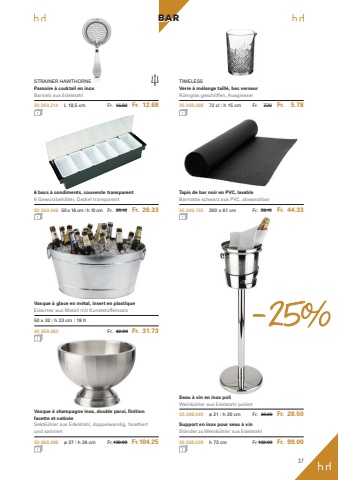 37BARVasque %u00e0 glace en m%u00e9tal, insert en plastiqueEiseimer aus Metall mit Kunststoffeinsatz50 x 32 I h 23 cm I 18 lt30.368.063 Fr. 42.30 Fr. 31.73Vasque %u00e0 champagne inox, double paroi, finition facette et satin%u00e9eSektk%u00fchler aus Edelstahl, doppelwandig, facettiertund satiniert30.368.096 %u00f8 37 I h 26 cm Fr.139.00 Fr.104.25Seau %u00e0 vin en inox poliWeink%u00fchler aus Edelstahl poliert30.368.040 %u00f8 21 I h 20 cm Fr. 38.00 Fr. 28.50Support en inox pour seau %u00e0 vinSt%u00e4nder zu Weink%u00fchler aus Edelstahl30.368.039 h 73 cm Fr.132.00 Fr. 99.006 bacs %u00e0 condiments, couvercle transparent6 Gew%u00fcrzbeh%u00e4lter, Deckel transparent30.369.046 50 x 16 cm I h 10 cm Fr. 35.10 Fr. 26.33Tapis de bar noir en PVC, lavableBarmatte schwarz aus PVC, abwaschbar30.369.150 300 x 61 cm Fr. 59.10 Fr. 44.33STRAINER HAWTHORNEPassoire %u00e0 cocktail en inoxBarsieb aus Edelstahl30.369.214 L 18,5 cm Fr. 16.90 Fr. 12.68TIMELESSVerre %u00e0 m%u00e9lange taill%u00e9, bec verseurR%u00fchrglas geschliffen, Ausgiesser30.369.269 72 cl I h 15 cm Fr. 7.70 Fr. 5.78-25