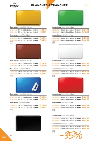 40PLANCHES %u00c0 TRANCHER PLANCHES %u00c0 TRANCHERSans rainure I ohne Rille I h 2 cm 52.391.049 GN 1/2 I 32,5 x 26,5 cm Fr.38.00 Fr.24.7052.391.051 GN 1/1 I 53 x 32,5 cm Fr.66.00 Fr.42.90Avec rainure I mit Rille I h 2 cm 52.391.050 GN 1/2 I 32,5 x 26,5 cm Fr.39.90 Fr.25.9452.391.052 GN 1/1 I 53 x 32,5 cm Fr.68.50 Fr.44.53Sans rainure I ohne Rille I h 2 cm52.391.061 GN 1/2 I 32,5 x 26,5 cm Fr.38.00 Fr.24.7052.391.063 GN 1/1 I 53 x 32,5 cm Fr.66.00 Fr.42.90Avec rainure I mit Rille I h 2 cm 52.391.062 GN 1/2 I 32,5 x 26,5 cm Fr.39.90 Fr.25.9452.391.064 GN 1/1 I 53 x 32,5 cm Fr.68.50 Fr.44.53Sans rainure I ohne Rille I h 2 cm52.391.075 GN 1/2 I 32,5 x 26,5 cm Fr.38.00 Fr.24.7052.391.077 GN 1/1 I 53 x 32,5 cm Fr.66.00 Fr.42.90Avec rainure I mit Rille I h 2 cm 52.391.076 GN 1/2 I 32,5 x 26,5 cm Fr.39.90 Fr.25.9452.391.078 GN 1/1 I 53 x 32,5 cm Fr.68.50 Fr.44.53Sans rainure I ohne Rille I h 2 cm52.391.088 GN 1/2 I 32,5 x 26,5 cm Fr.38.00 Fr.24.7052.391.090 GN 1/1 I 53 x 32,5 cm Fr.66.00 Fr.42.90Avec rainure I mit Rille I h 2 cm 52.391.089 GN 1/2 I 32,5 x 26,5 cm Fr.39.90 Fr.25.9452.391.091 GN 1/1 I 53 x 32,5 cm Fr.68.50 Fr.44.53Sans rainure I ohne Rille I h 2 cm52.391.055 GN 1/2 I 32,5 x 26,5 cm Fr.38.00 Fr.24.7052.391.057 GN 1/1 I 53 x 32,5 cm Fr.66.00 Fr.42.90Avec rainure I mit Rille I h 2 cm 52.391.056 GN 1/2 I 32,5 x 26,5 cm Fr.39.90 Fr.25.9452.391.058 GN 1/1 I 53 x 32,5 cm Fr.68.50 Fr.44.53Sans rainure I ohne Rille I h 2 cm52.391.069 GN 1/2 I 32,5 x 26,5 cm Fr.36.00 Fr.23.4052.391.071 GN 1/1 I 53 x 32,5 cm Fr.63.00 Fr.40.95Avec rainure I mit Rille I h 2 cm 52.391.070 GN 1/2 I 32,5 x 26,5 cm Fr.38.50 Fr.25.0352.391.072 GN 1/1 I 53 x 32,5 cm Fr.65.50 Fr.42.58Sans rainure I ohne Rille I h 2 cm52.391.081 GN 1/2 I 32,5 x 26,5 cm Fr.38.00 Fr.24.7052.391.083 GN 1/1 I 53 x 32,5 cm Fr.66.00 Fr.42.90Avec rainure I mit Rille I h 2 cm 52.391.082 GN 1/2 I 32,5 x 26,5 cm Fr.39.90 Fr.25.9452.391.084 GN 1/1 I 53 x 32,5 cm Fr.68.50 Fr.44.53-35