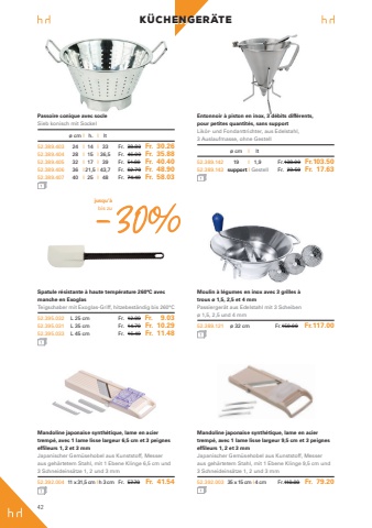 42-30jusqu%u2019%u00e0bis zuK%u00dcCHENGER%u00c4TE K%u00dcCHENGER%u00c4TEPassoire conique avec socleSieb konisch mit Sockel%u00f8 cm I h. I lt52.389.403 24 I 14 I 33 Fr. 38.80 Fr. 30.2652.389.404 28 I 15 I 36,5 Fr. 46.00 Fr. 35.8852.389.405 32 I 17 I 39 Fr. 51.80 Fr. 40.4052.389.406 36 I21,5 I 43,7 Fr. 62.70 Fr. 48.9052.389.407 40 I 25 I 48 Fr. 74.40 Fr. 58.03Entonnoir %u00e0 piston en inox, 3 d%u00e9bits diff%u00e9rents,pour petites quantit%u00e9s, sans supportLik%u00f6r- und Fondanttrichter, aus Edelstahl,3 Auslaufmasse, ohne Gestell%u00f8 cm I lt52.389.142 19 I 1,9 Fr.138.00 Fr.103.5052.389.143 support I Gestell Fr. 23.50 Fr. 17.63Moulin %u00e0 l%u00e9gumes en inox avec 3 grilles %u00e0trous %u00f8 1,5, 2,5 et 4 mmPassierger%u00e4t aus Edelstahl mit 3 Scheiben%u00f8 1,5, 2,5 und 4 mm52.389.121 %u00f8 32 cm Fr.150.00 Fr.117.00Spatule r%u00e9sistante %u00e0 haute temp%u00e9rature 260%u00b0C avec manche en ExoglasTeigschaber mit Exoglas-Griff, hitzebest%u00e4ndig bis 260%u00b0C52.395.032 L 25 cm Fr. 12.90 Fr. 9.0352.395.031 L 35 cm Fr. 14.70 Fr. 10.2952.395.033 L 45 cm Fr. 16.40 Fr. 11.48Mandoline japonaise synth%u00e9tique, lame en acier tremp%u00e9, avec 1 lame lisse largeur 9,5 cm et 3 peignes effileurs 1, 2 et 3 mmJapanischer Gem%u00fcsehobel aus Kunststoff, Messeraus geh%u00e4rtetem Stahl, mit 1 Ebene Klinge 9,5 cm und3 Schneideins%u00e4tze 1, 2 und 3 mm52.392.003 35 x 15 cm I 4 cm Fr.110.00 Fr. 79.20Mandoline japonaise synth%u00e9tique, lame en acier tremp%u00e9, avec 1 lame lisse largeur 6,5 cm et 3 peignes effileurs 1, 2 et 3 mmJapanischer Gem%u00fcsehobel aus Kunststoff, Messeraus geh%u00e4rtetem Stahl, mit 1 Ebene Klinge 6,5 cm und3 Schneideins%u00e4tze 1, 2 und 3 mm52.392.004 11 x 31,5 cm I h 3 cm Fr. 57.70 Fr. 41.54