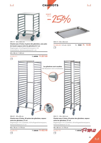 45CHARIOTSGN 1/1 - 53 x 32,5 cmChariot avec 2 freins, 8 paires des glissi%u00e8res, avec plan de travail, espace entre les glissi%u00e8res 8,1 cmRegalwagen, 8 Auflageschienenpaare, mit Arbeitsfl%u00e4che, Schienenabstand 8,1 cm46 x 66 cm I h 90 cm 51.376.171 Fr.447.00 Fr.357.60GN 1/1 I 53 x 32,5 cm52.388.248 h 2 cm I 2,5 lt Fr. 18.40 Fr. 13.80GN 2/1 - 53 x 65 cmChariot avec 2 freins, 20 paires des glissi%u00e8res, espace entre les glissi%u00e8res 7,7 cmRegalwagen mit 2 Feststell, 20 Auflageschienenpaare,Schienenabstand 7,7 cm66 x 78 cm I h 179 cm 51.376.172 Fr.528.00 Fr.422.40GN 1/1 - 53 x 32,5 cmChariot avec 2 freins, 20 paires des glissi%u00e8res, espace entre les glissi%u00e8res 7,7 cmRegalwagen mit 2 Feststell, 20 Auflageschienenpaare,Schienenabstand 7,7 cm46 x 66 cm I h 179 cm 51.376.173 Fr.487.00Les glissi%u00e8res sont soud%u00e9esDie Rutschen sind verschweiss-25jusqu%u2019%u00e0bis zuFr.389.60
