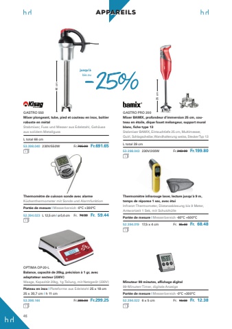 46APPAREILS APPAREILSThermom%u00e8tre de cuisson sonde avec alarmeK%u00fcchenthermometer mit Sonde und AlarmfunktionPort%u00e9e de mesure I Messerbereich -0%u00b0C +300%u00b0C52.394.023 L 12,5 cm I %u00f8 0,4 cm Fr. 74.30 Fr. 59.44GASTRO 550Mixer plongeant, tube, pied et couteau en inox, bo%u00eetier robuste en m%u00e9talStabmixer, Fuss und Messer aus Edelstahl, Geh%u00e4useaus solidem MetallgussL total 66 cm53.398.040 230V/550W Fr.795.00 Fr.691.65GASTRO PRO 200Mixer BAMIX, profondeur d'immersion 25 cm, couteau en %u00e9toile, dique fouet m%u00e9langeur, support mural blanc, fiche type 13Stabmixer BAMIX, Eintauchtiefe 25 cm, Multimesser, Quirl, Schlagscheibe, Wandhalterung weiss, Stecker Typ 13L total 39 cm53.398.043 230V/200W Fr.243.00 Fr.199.80OPTIMA OP-20-LBalance, capacit%u00e9 de 20kg, pr%u00e9cision %u00e0 1 gr, avecadaptateur secteur (230V)Waage, Kapazit%u00e4t 20kg, 1g-Teilung, mit Netzger%u00e4t (230V)Plateau en inox I Plateforme aus Edelstahl 25 x 18 cm25 x 30,7 cm I h 11 cm 53.398.144 Fr.399.00 Fr.299.25Thermom%u00e8tre infrarouge laser, lecture jusqu'%u00e0 9 m, temps de r%u00e9ponse 1 sec, avec %u00e9tuiInfrarot-Thermometer, Distanzablesung bis 9 Meter,Antwortzeit 1 Sek, mit Schutzh%u00fcllePort%u00e9e de mesure I Messerbereich -60%u00b0C +500%u00b0C52.394.019 17,5 x 4 cm Fr. 85.60 Fr. 68.4840 cm25 cmMinuteur 99 minutes, affichage digital99-Minuten-Timer, digitale AnzeigePort%u00e9e de mesure I Messerbereich -0%u00b0C +300%u00b0C52.394.022 6 x 5 cm Fr. 16.50 Fr. 12.38-25jusqu%u2019%u00e0bis zu