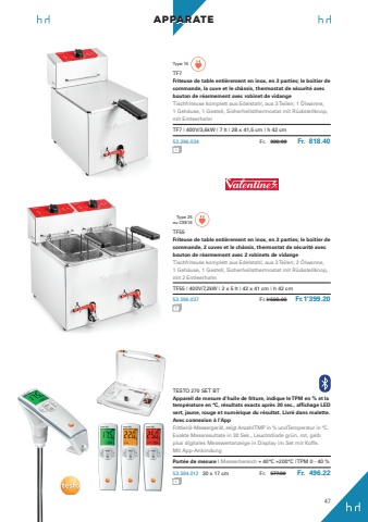 47APPARATETF7Friteuse de table enti%u00e8rement en inox, en 3 parties; le bo%u00eetier de commande, la cuve et le ch%u00e2ssis, thermostat de s%u00e9curit%u00e9 avec bouton de r%u00e9armement avec robinet de vidangeTischfriteuse komplett aus Edelstahl, aus 3 Teilen; 1 %u00d6lwanne,1 Geh%u00e4use, 1 Gestell, Sicherheitsthermostat mit R%u00fcckstellknop,mit EntleerhahnTF7 I 400V/3,6kW I 7 lt I 28 x 41,5 cm I h 42 cm53.396.034 Fr. 930.00 Fr. 818.40TF55Friteuse de table enti%u00e8rement en inox, en 3 parties; le bo%u00eetier de commande, 2 cuves et le ch%u00e2ssis, thermostat de s%u00e9curit%u00e9 avec bouton de r%u00e9armement avec 2 robinets de vidangeTischfriteuse komplett aus Edelstahl, aus 3 Teilen; 2 %u00d6lwanne,1 Geh%u00e4use, 1 Gestell, Sicherheitsthermostat mit R%u00fcckstellknop,mit 2 EntleerhahnTF55 I 400V/7,2kW I 2 x 5 lt I 42 x 41 cm I h 42 cm53.396.037 Fr.1'590.00 Fr.1'399.20TESTO 270 SET BTAppareil de mesure d'huile de friture, indique le TPM en % et la temp%u00e9rature en %u00b0C, r%u00e9sultats exacts apr%u00e8s 30 sec., affichage LED vert, jaune, rouge et num%u00e9rique du r%u00e9sultat. Livr%u00e9 dans malette. Avec connexion %u00e0 l'AppFrittier%u00f6l-Messerger%u00e4t, zeigt Anzahl TMP in % und Temperatur in %u00b0C.Exakte Messresultate in 30 Sek., Leuchtdiode gr%u00fcn, rot, gelb plus digitales Messwertanzeige in Display im Set mit Koffe.Mit App-AnbindungPort%u00e9e de mesure I Messerbereich + 40%u00b0C +200%u00b0C I TPM 0 - 40 %53.394.012 30 x 17 cm Fr. 577.00 Fr. 496.22Type 15Type 25ou CEE16