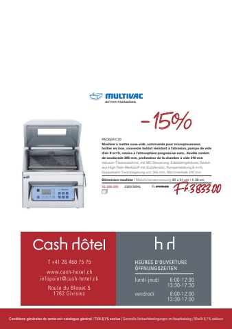 Conditions g%u00e9n%u00e9rales de vente voir catalogue g%u00e9n%u00e9ral / TVA 8,1% exclue | Generelle Verkaufsbedingungen im Hauptkatalog / MwSt 8,1% exklusivPACKER C70Machine %u00e0 mettre sous-vide, commande pour microprocesseur, bo%u00eetier en inox, couvercle hublot r%u00e9sistant %u00e0 l'abrasion, pompe de vide d'air 8 m3/h, remise %u00e0 l'atmosph%u00e8re progressive auto., double cordon de soudurede 305 mm, profondeur de la chambre %u00e0 vide 310 mmVakuum-Tischmaschine, mit MC-Steuerung, Edelstahlgeh%u00e4use, Deckel aus High-Tech-Werkstoff mit Sichtfenster, Pumpenleistung 8 m3/h, Doppelnaht-Trennsiegelung von 305 mm, Mammertiefe 310 mmDimension machine I Maschinenabmessung 40 x 51 cm I h 38 cm53.398.095 230V/50Hz Fr.4'510.00 Fr.3833.00-15