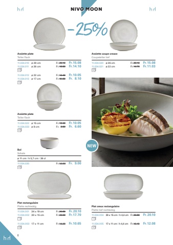 6NIVO MOONAssiette plateTeller flach11.034.010 %u00f8 29 cm Fr.20.10 Fr.15.0811.034.011 %u00f8 26 cm Fr.18.80 Fr.14.1011.034.012 %u00f8 22 cm Fr.13.40 Fr.10.0511.034.013 %u00f8 17 cm Fr.10.80 Fr. 8.10Assiette plateTeller flach11.034.022 %u00f8 15 cm Fr.13.40 Fr.10.0511.034.033 %u00f8 9 cm Fr. 8.80 Fr. 6.60Plat rectangulairePlatte rechteckig11.034.001 34 x 19 cm Fr.26.80 Fr.20.1011.034.002 30 x 15 cm Fr.23.60 Fr.17.7011.034.003 17 x 11 cm Fr.14.20 Fr.10.65Plat creux rectangulairePlatte tief rechteckig11.034.004 30 x 15 cm I h 4,4 cm Fr.26.80 Fr.20.1011.034.005 17 x 11 cm I h 4,4 cm Fr.16.10 Fr.12.08Assiette coupe creuseCoupeteller tief11.034.020 %u00f8 26 cm Fr.20.10 Fr.15.0811.034.021 %u00f8 22 cm Fr.14.70 Fr.11.03BolSchale%u00f8 11 cm I h 5,7 cm I 36 cl11.034.030 Fr.12.00 Fr. 9.00-25