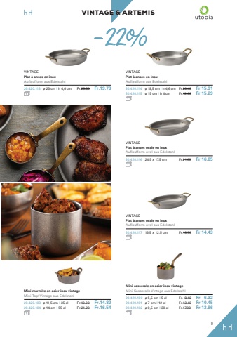 9VINTAGE & ARTEMIS-22Mini-marmite en acier inox vintageMini-Topf Vintage aus Edelstahl20.420.103 %u00f8 11,5 cm I 35 cl Fr.19.00 Fr.14.8220.420.104 %u00f8 14 cm I 55 cl Fr.21.20 Fr.16.54Mini-casserole en acier inox vintageMini-Kasserolle Vintage aus Edelstahl20.420.100 %u00f8 5,5 cm I 5 cl Fr. 8.10 Fr. 6.3220.420.101 %u00f8 7 cm I 12 cl Fr.13.40 Fr.10.4520.420.102 %u00f8 9,5 cm I 30 cl Fr.17.90 Fr.13.96VINTAGEPlat %u00e0 anses ovale en inoxAuflaufform oval aus Edelstahl20.420.117 16,5 x 12,5 cm Fr.18.50 Fr.14.43VINTAGEPlat %u00e0 anses ovale en inoxAuflaufform oval aus Edelstahl20.420.116 24,5 x 17,5 cm Fr.21.60 Fr.16.85VINTAGEPlat %u00e0 anses en inoxAuflaufform aus Edelstahl20.420.114 %u00f8 19,5 cm I h 4,6 cm Fr.20.40 Fr.15.9120.420.115 %u00f8 15 cm I h 4 cm Fr.19.60 Fr.15.29VINTAGEPlat %u00e0 anses en inoxAuflaufform aus Edelstahl20.420.113 %u00f8 23 cm I h 4,6 cm Fr.25.30 Fr.19.73